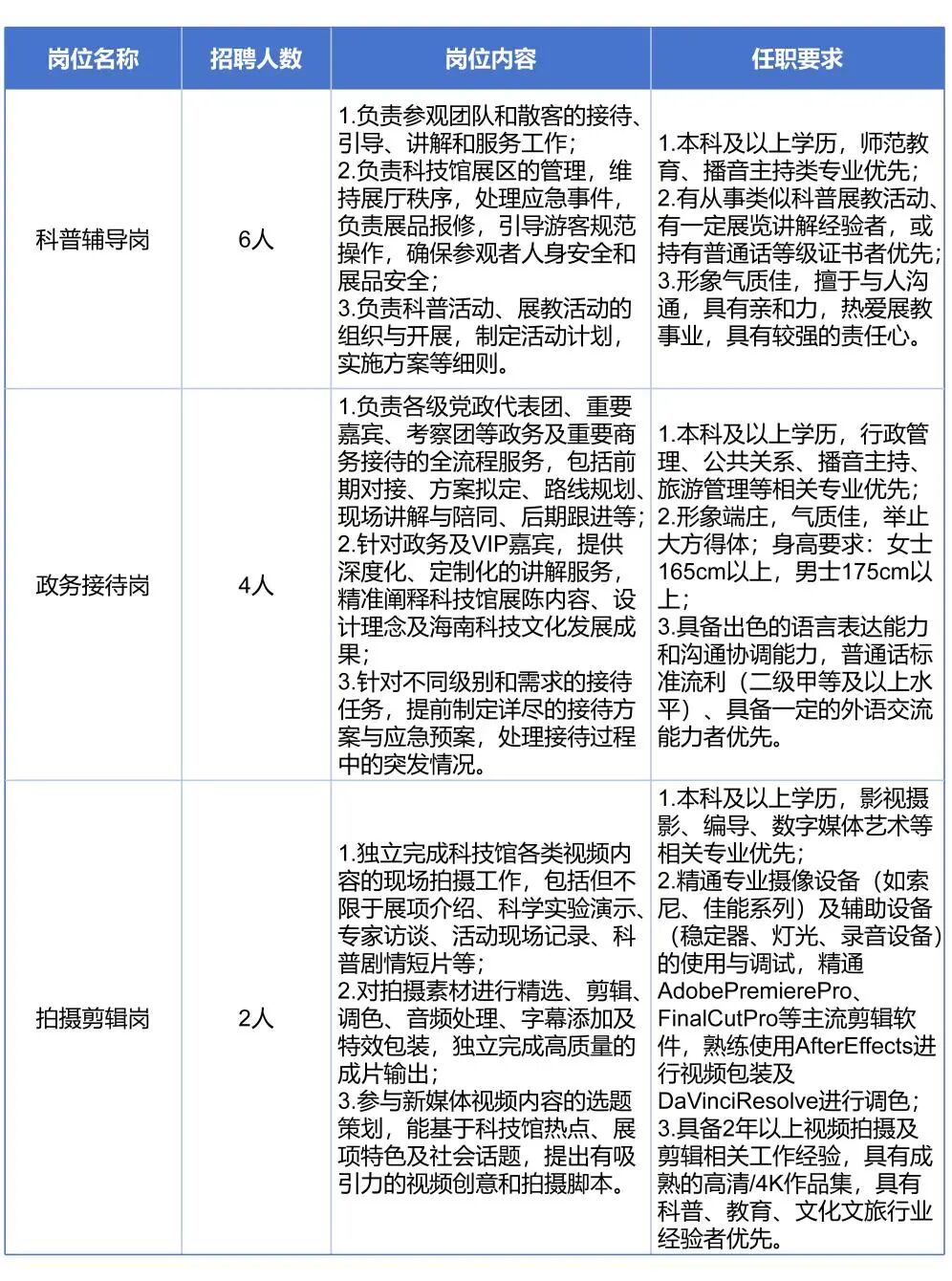 4. 具备岗位所需的专业或技能条件,详见《海南科技馆工作人员招聘岗位表》。