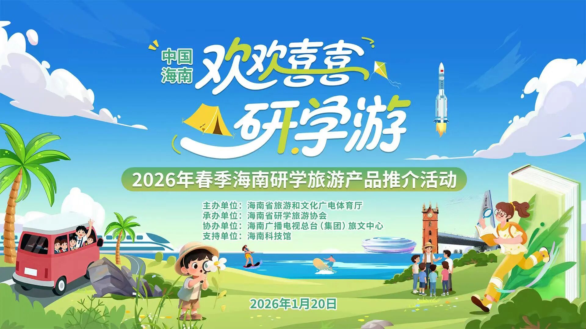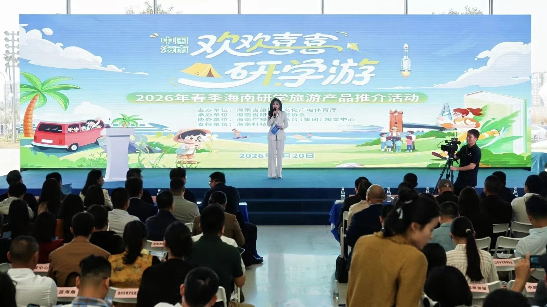 春潮涌动研学热,琼岛聚力启新程。2026年1月20日下午,“欢欢喜喜研学游”2026年春季海南研学旅游产品推介活动在海南科技馆举行。来自省旅文厅、教育厅、各市县旅文部门负责人,全省旅游行业协会及研学会员单位负责人,美团、同程、携程等主流OTA平台代表,新闻媒体记者近200人共同出席,为海南研学发展搭建政企校多方对接的交流平台。